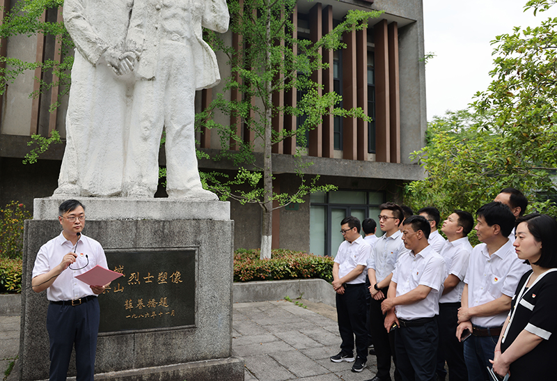 在沈干城、沈樂(lè)山烈士塑像前,鄭浩為大家講述了兩位烈士對(duì)杭州工人運(yùn)動(dòng)的偉大貢獻(xiàn),回顧了馬克思主義在杭州的傳播與影響,并帶領(lǐng)大家重溫了入黨誓詞。